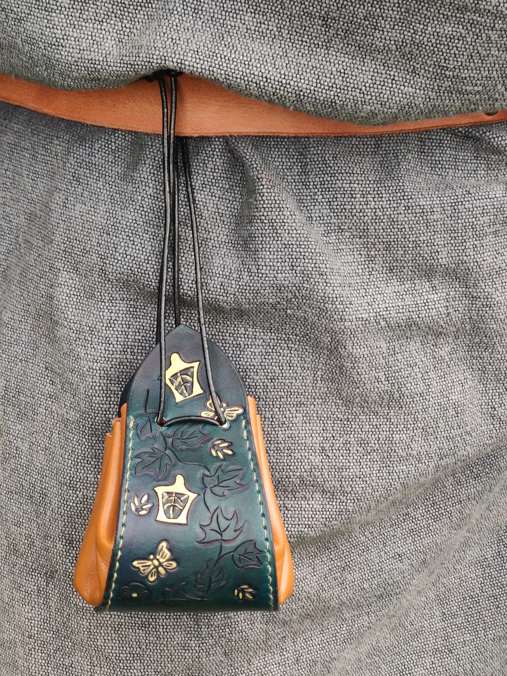 Notre Bourse en cuir » La contrée des elfes » est une bourse faite entièrement à la main. Nous avons combiné plusieurs techniques de travail du cuir afin de vous proposer une bourse unique, réalisée en cuir de vachette au tannage végétal. Le cuir a été repoussé pour faire apparaître un motif de feuille et de lanterne, puis teinté en vert et rehaussé d’une peinture dorée. Une fois achevée, la pièce a été cousue à la main selon la technique traditionnelle du point sellier.
